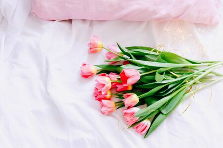 A bouquet of white tulips on a white background. A bouquet of spring flowers on the bed. Holiday. Warm spring.
