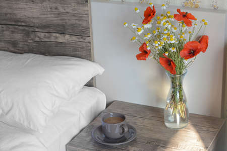 Bouquet of beautiful wildflowers and cup with coffee on nightstand in bedroom