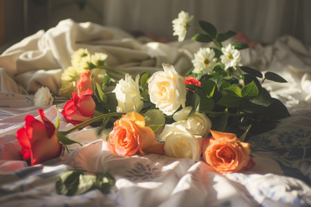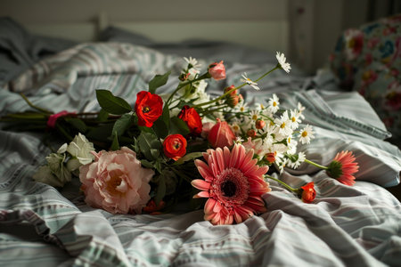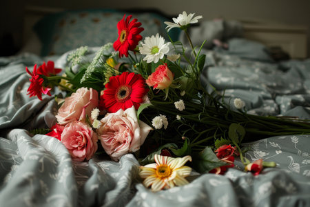 Exquisite vibrant blooming flowers artfully arranged on a soft inviting bedspread
