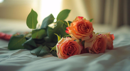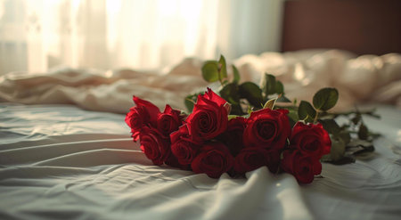 a beautiful bouquet of roses placed on a cozy bed, capturing the essence of Valentine's Day celebrations in a minimalist modern style composition