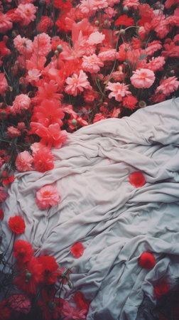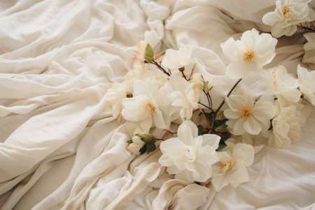A serene composition featuring delicate pink and white flowers on soft white fabric. Perfect for showcasing beauty, elegance, and tranquility in design projects.