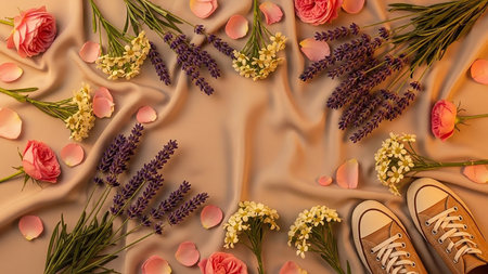 A flat lay composition featuring pink roses, lavender, and yellow flowers arranged on beige satin fabric, with tan canvas sneakers.