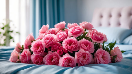 Beautiful bouquet of pink roses on blue bedding in bedroom