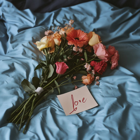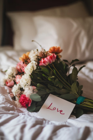 A bouquet of flowers with the inscription love lies on the bed, Valentine's Day