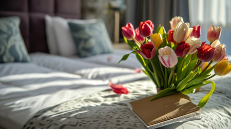 Vibrant red tulips arranged on cozy bedspread in sunny room. That the image is generated using AI.
