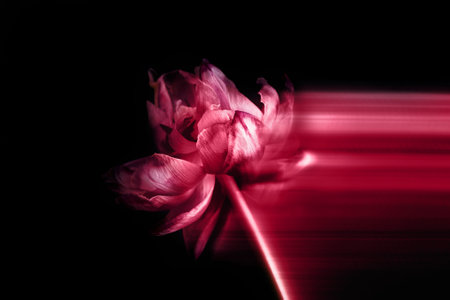 Dried parrot style tulip with long exposure tail. Toned on viva magenta, color of the year 2023. Concept of sadness, lost, ended love, dark moody macro shot