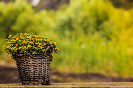 Wicker flower pot with yellow flowers inside, green natural background outdoor shot.