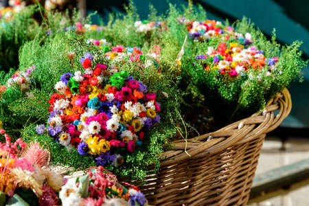Colorful fresh flowers in basket on sale in flower market. Assortment of fresh spring flowers
