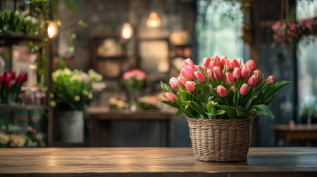 Basket of Pink Tulips in a Cozy Flower Shop Interior. High quality photo