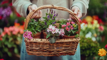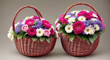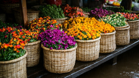 A stunning array of vibrant flowers arranged beautifully in handwoven baskets. This captivating image showcases fresh blooms in a colorful display, perfect for spring themes.
