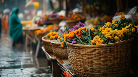 A stunning visualization of a flower market featuring vibrant bouquets in wicker baskets, surrounded by lush greenery, and illuminated by soft natural light.