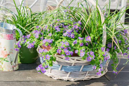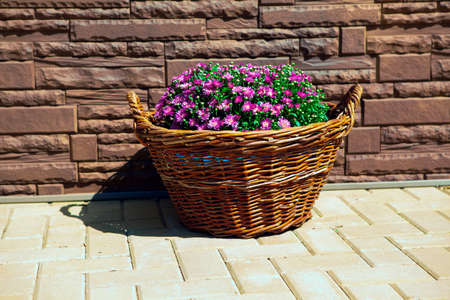 Street and garden decoration. Blooming violet flowers in whickered basket.