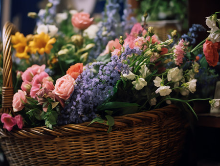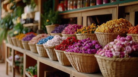 A charming flower shop scene showcasing a variety of colorful blooms displayed in woven baskets, capturing the essence of nature beauty in a warm, inviting atmosphere.
