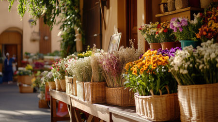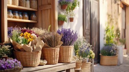 A picturesque market stall adorned with vibrant flowers and fresh herbs in woven baskets, showcasing rustic charm and inviting shoppers to explore nature's beauty.