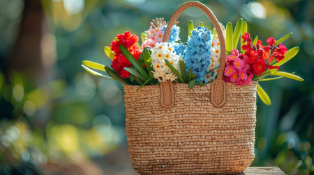 A handcrafted straw bag, adorned with hyacinth and carnation flowers, vibrant colors, outdoor beauty