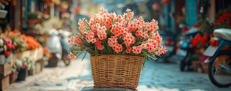 Free flower delivery in a charming alley with colorful blooms and a rustic basket