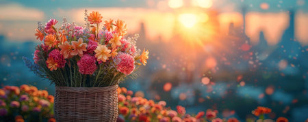 Straw bag holds hyacinth, carnation in front, blurry cityscape at sunset behind, contrasting scenes