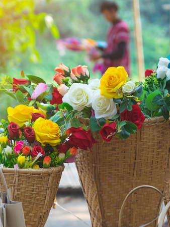 Beautiful bouquet roses flower artificial in vintage wicker basket. Artificial multicolor flowers made from cloth or fabric look like real flower. Retro style.Valentines Day concept. Selective focus.