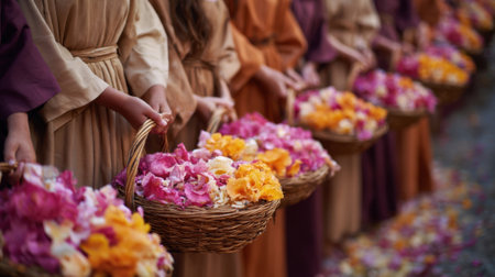Closeup of a group of women holding baskets of flower petals, tering them along the procession path as a symbol of honoring Jesus final journey