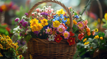 A close-up view of a basket filled with spring flowers, ready to be handed out during a May Day celebration, with the focus on the variety and brightness of the flowers.