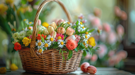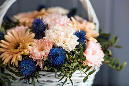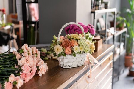 Beautiful flower composition a bouquet in a wicker basket. Floristry concept. Spring colors