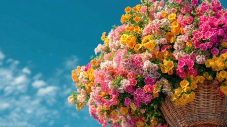 A stunning display of colorful flowers in a woven basket set against a bright blue sky and fluffy clouds, evoking a sense of joy and freshness typical of spring.