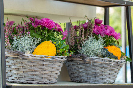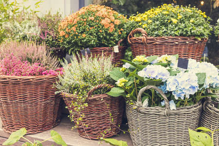 Heather, chrysanthemum, hydrangea and other autumn flowers in pots in flower shop. Halloween and Thanksgiving fall season decoration with flowers in trendy rattan baskets