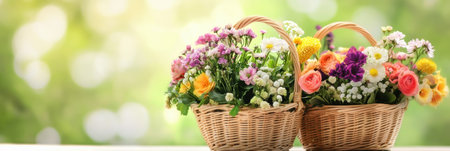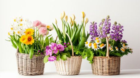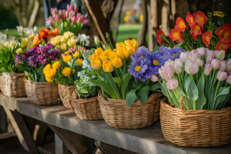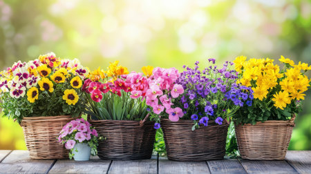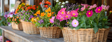 Wicker baskets overflowing with colorful spring flowers, creating a vibrant and cheerful display on a rustic wooden table