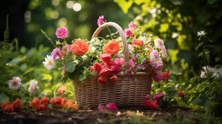 A photo of a basket brimming with freshly picked flowers in a charming garden setting