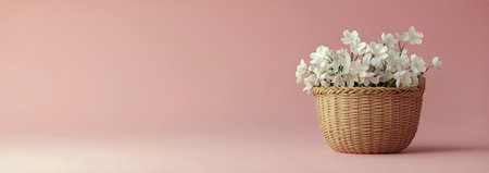 A wicker basket filled with fresh pink and white flowers, set against a soft pink and blue pastel background