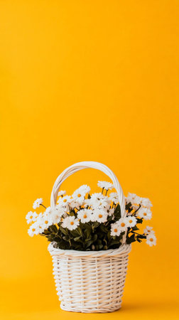 White wicker basket brimming with fresh white daisies sits against a vibrant yellow backdrop, creating a cheerful and inviting spring or summer scene with ample copy space