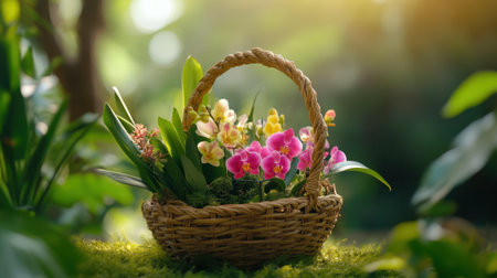 Natural basket full of orchid blooms and tropical foliage, set in warm sunlight