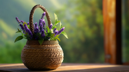 Soft morning light highlighting lavender in a boho-style woven basket