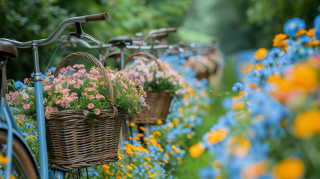 bike with flower basket, vintage bicycles with baskets overflowing with vibrant flowers, reminiscent of a nostalgic summer moment from yesteryear