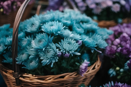 Blue chrysanthemums in a basket, close-up