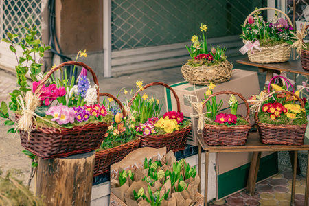 Spring and gardening concept. Colorful vibrant flower baskets displayed at outdoor market in springtime, showcasing spring blooms in baskets and wrapping