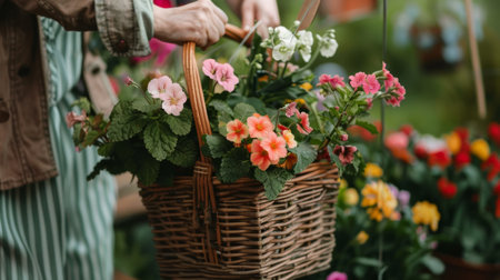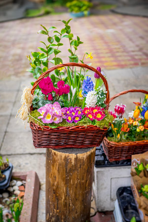 Decorative spring flower basket with blooming primroses and hyacinths close-up. Vibrant floral arrangement symbolizes renewal, spring, seasonal beauty