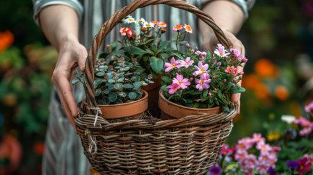 A colorful arrangement of seasonal flowers is beautifully displayed in a wicker basket, highlighting the beauty of a sunny outdoor garden.