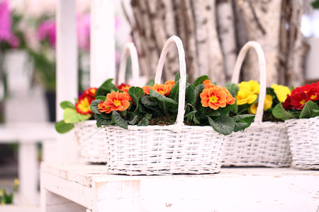 primrose flowers in white wicker basket