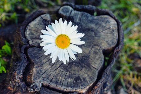White Daisy. Chamomile ordinary sunny day; growing from hemp. Daisy flower in summer close-up.