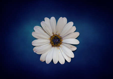 Osteospermum ecklonis flower (Cape Marguerite flower, Dimorphotheca). White daisy flower, isolated on vintage royal blue background
