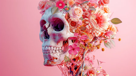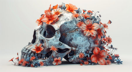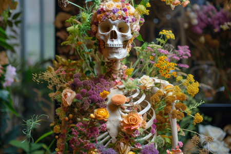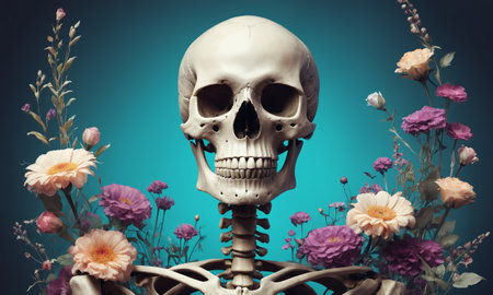 Aesthetic floral skeleton illustration showcasing a human skeleton adorned with vibrant flowers, representing life, beauty, and nature s harmony