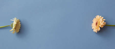 Gerberas isolated on a blue paper background. Blooming concept.