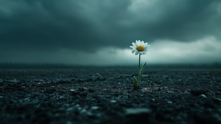 Single daisy blooming on a desolate landscape under stormy skies