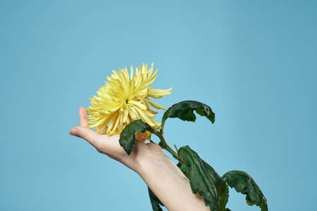 Yellow flower and female hand on a blue background cropped view close-up