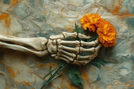 A skeleton hand delicately holds vibrant orange flowers against textured background, creating striking contrast of life and death..