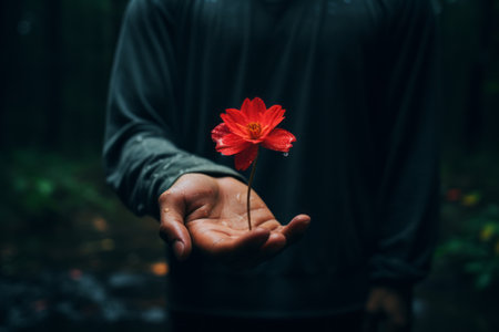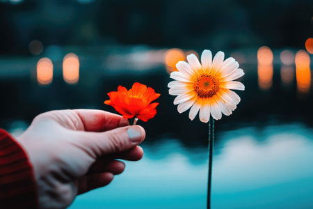 Volunteering and Compassion: Hand Holding Two Flowers at Dusk Reflecting Peaceful Unity.