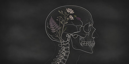 A side profile of a human skull, meticulously drawn in white chalk on a dark grey background. Flowers sprout from the skulls interior, creating a striking contrast between life and death. The background is a dark, solid gray. The image evokes a sense of quiet contemplation.