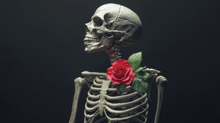 Skeleton adorned with a red rose on collarbone