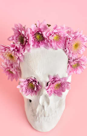 human skull with flowers on pink background